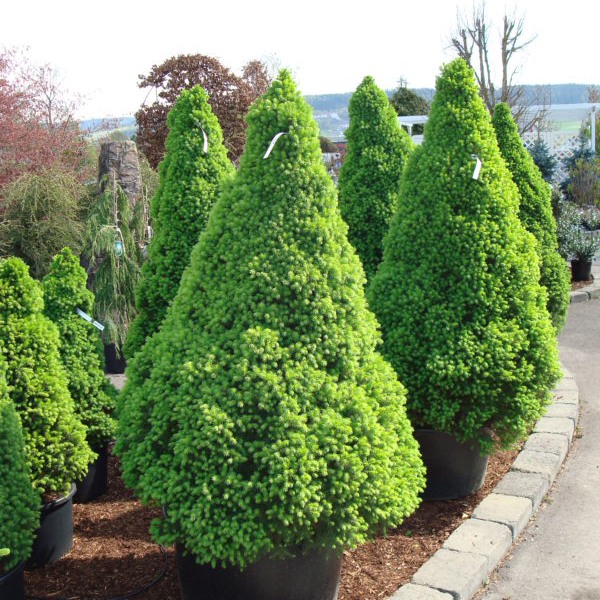Ель канадская «Conica» (Picea glauca «Conica») – хвойное вечнозеленое карликовое дерево достигает в высоту 2,4 метра, а в ширину – 2. Кора серо-коричневого цвета. Хвоя светло-зеленого цвета. Шишки светло-коричневого цвета, молодые – зеленого, появляются очень редко.